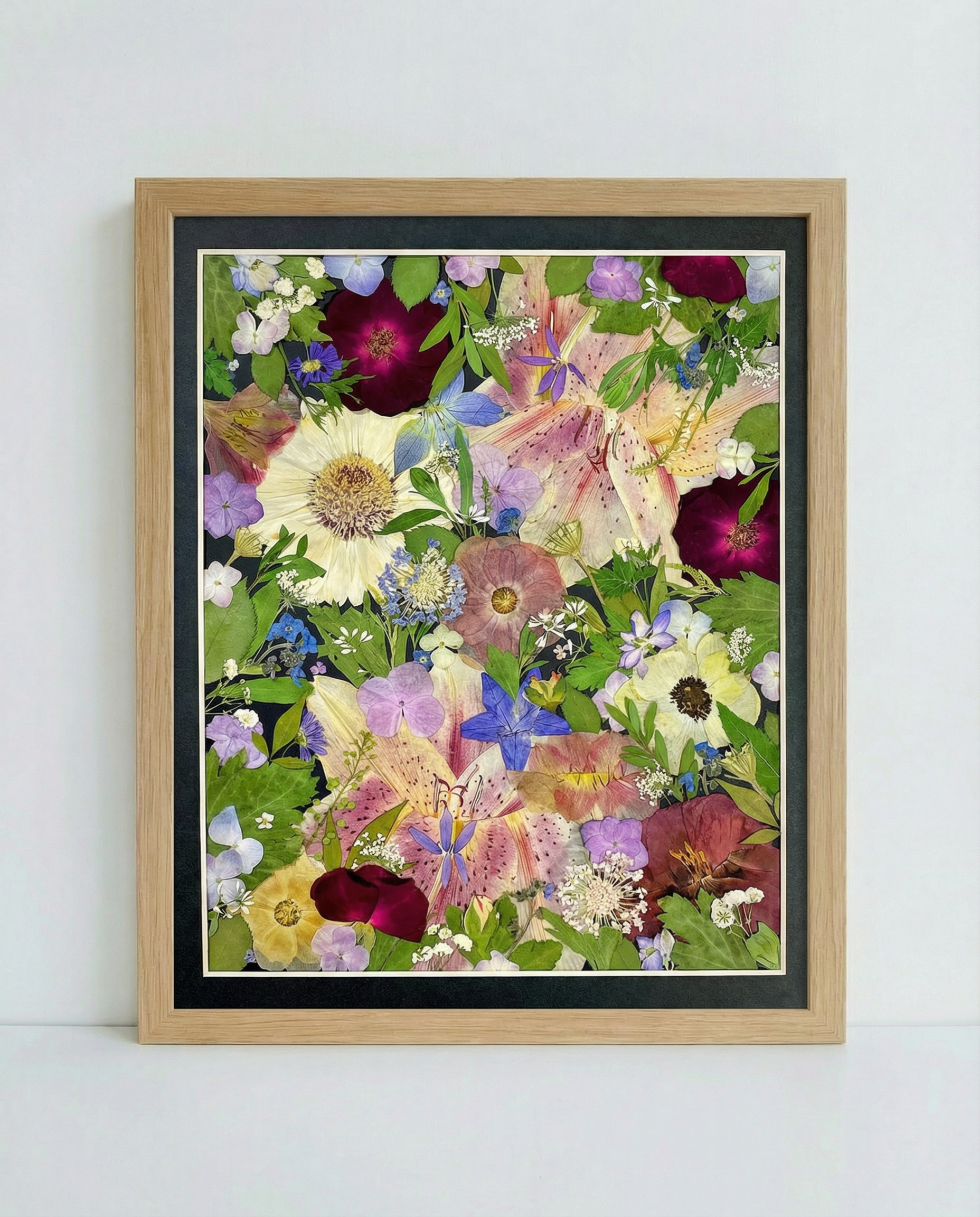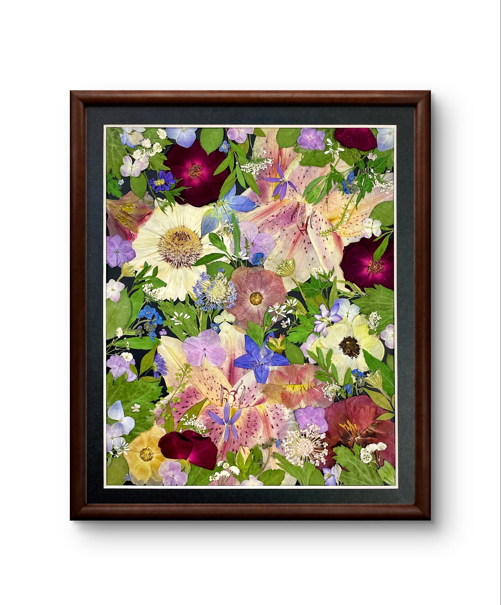 ▪ Product details: This is a small-sized pressed floral frame art, displaying the arrangement perfectly against the black background paper, covered by clear acrylic board. Our frames are crafted from beautiful 100% hardwood, with our flower florists meticulously selecting the finest seasonal blooms. The material we use is 100% flowers and plants.