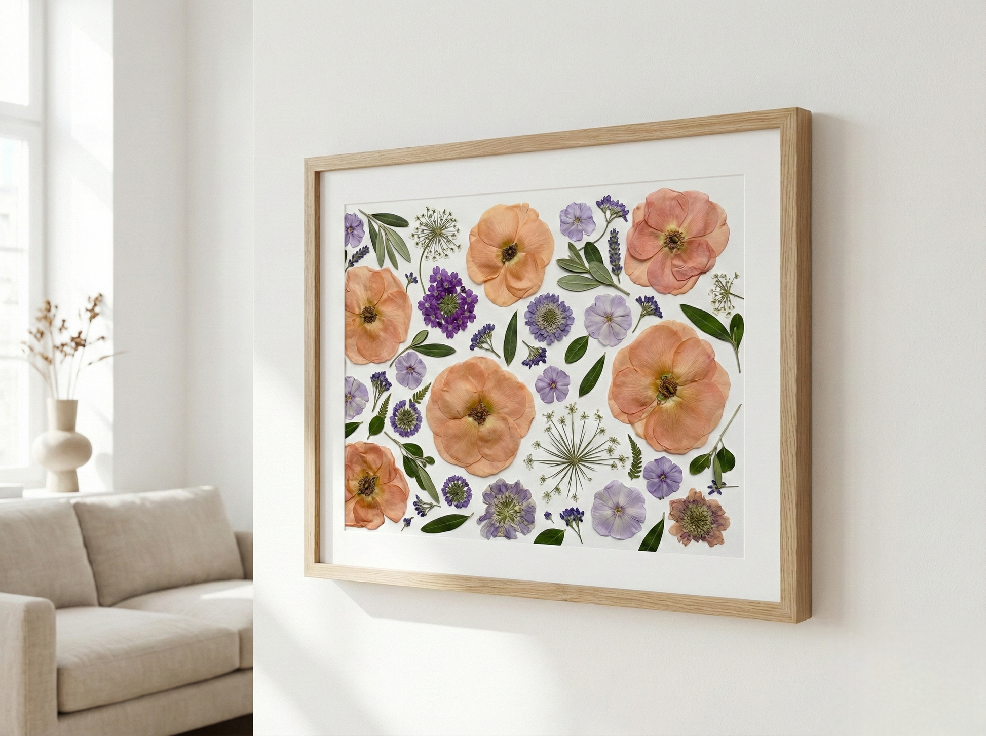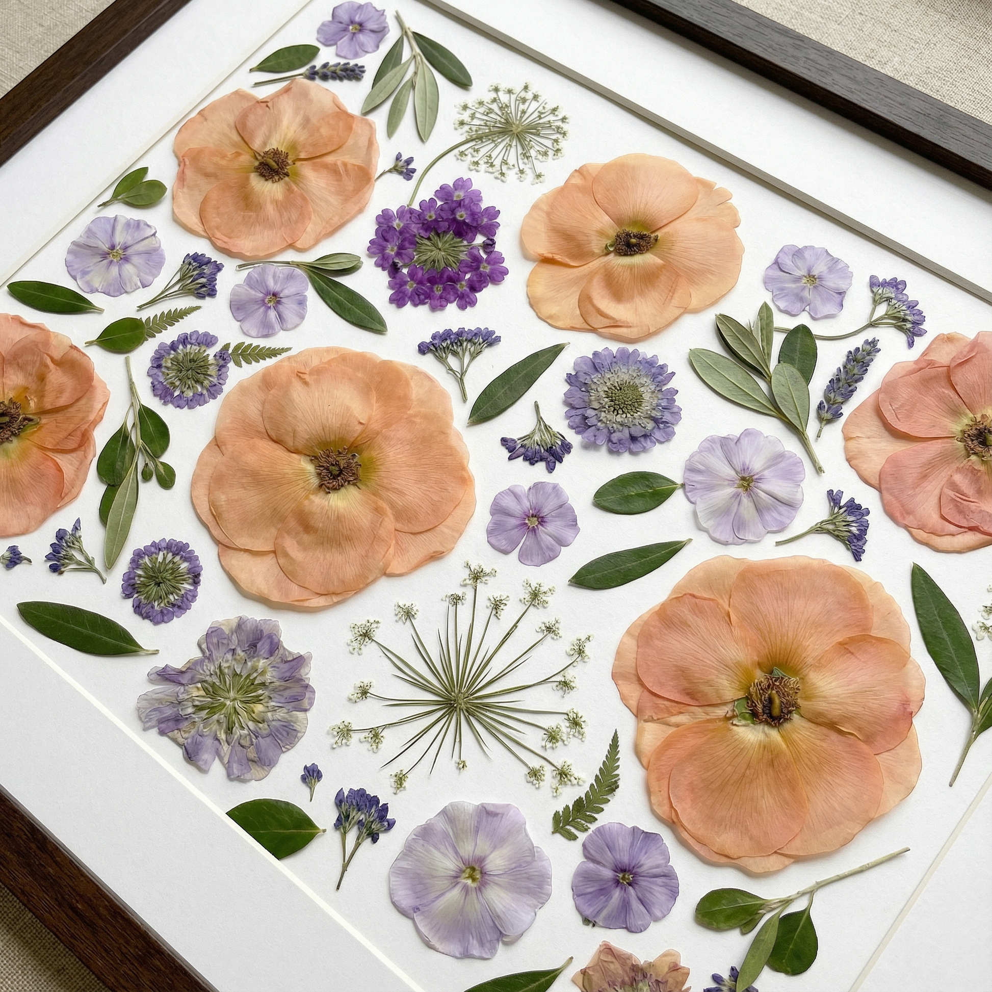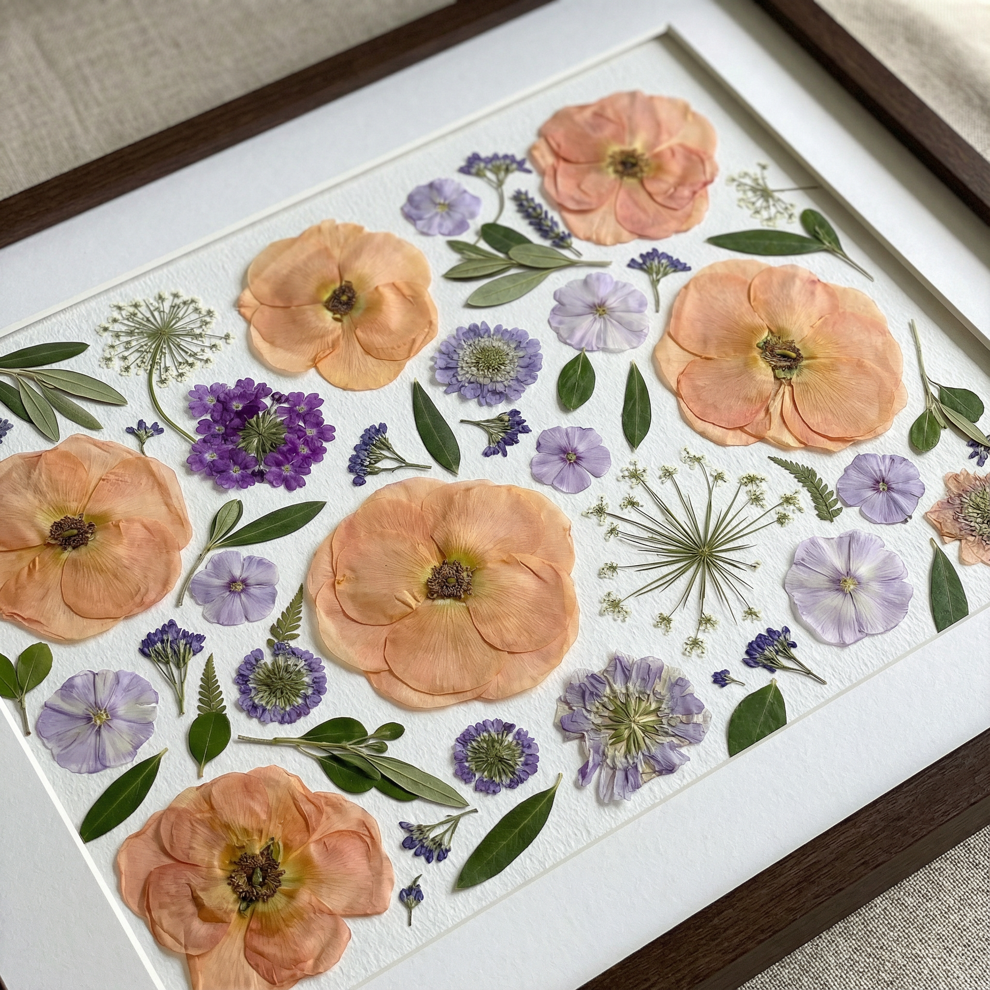Our florist carefully arranges and glues dried flower petals onto background paper, creating a unique design. Each petal is sourced from the finest seasonal blooms, meticulously chosen and pressed by our skilled florists.