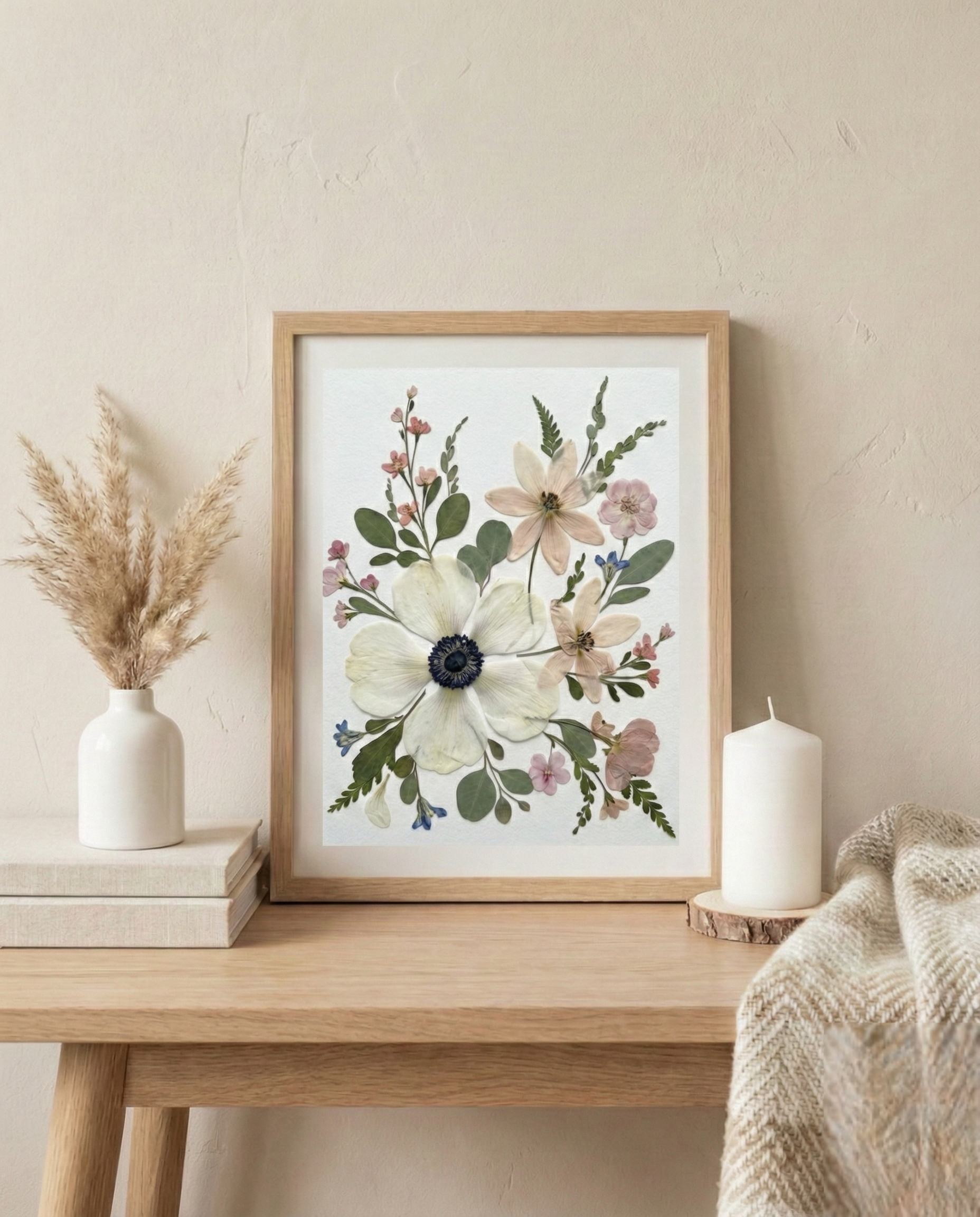 Our florist carefully arranges and glues dried flower petals onto background paper, creating a unique design. Each petal is sourced from the finest seasonal blooms, meticulously chosen and pressed by our skilled florists.