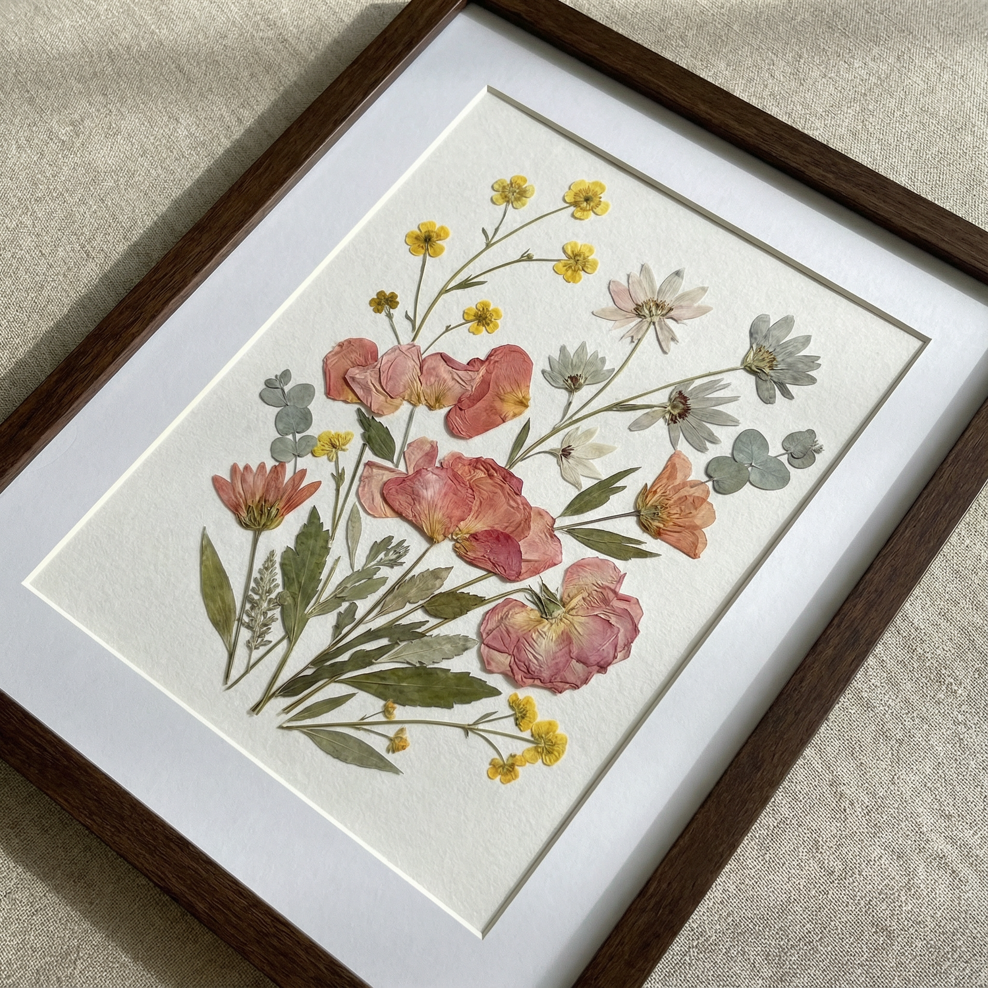 Our florist carefully arranges and glues dried flower petals onto background paper, creating a unique design. Each petal is sourced from the finest seasonal blooms, meticulously chosen and pressed by our skilled florists.