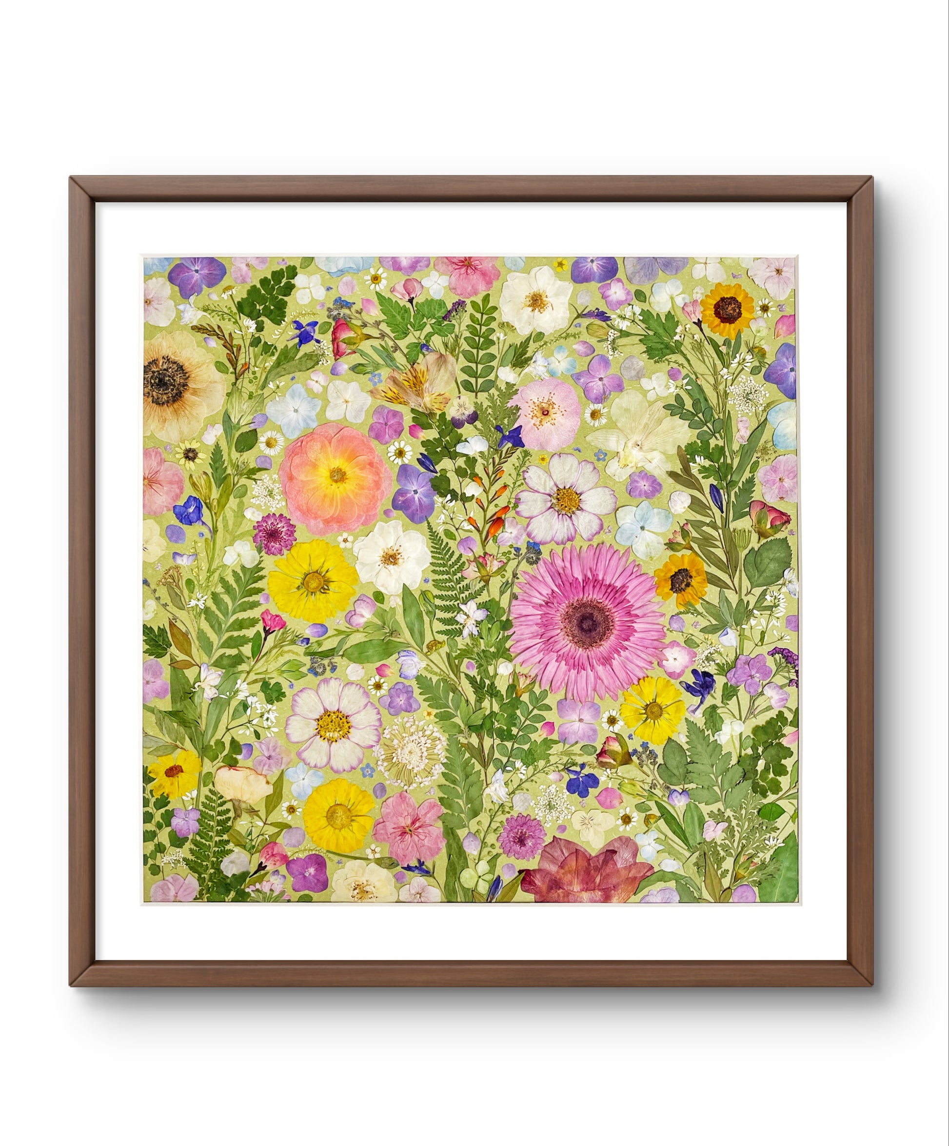 This is a large-sized pressed floral frame artwork. Our florist carefully arranges and glues dried flower petals onto background paper, creating a unique design. Each petal is sourced from the finest seasonal blooms, meticulously chosen and pressed by our skilled florists.