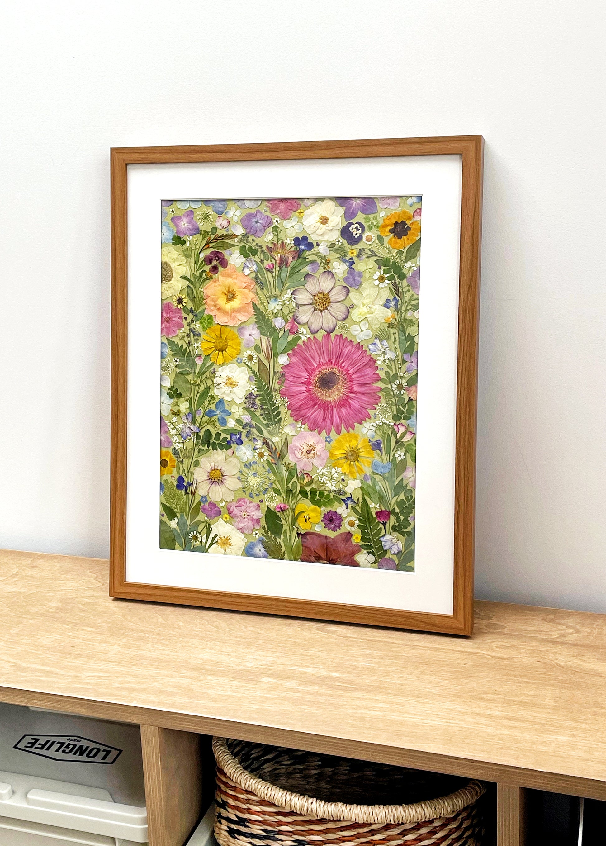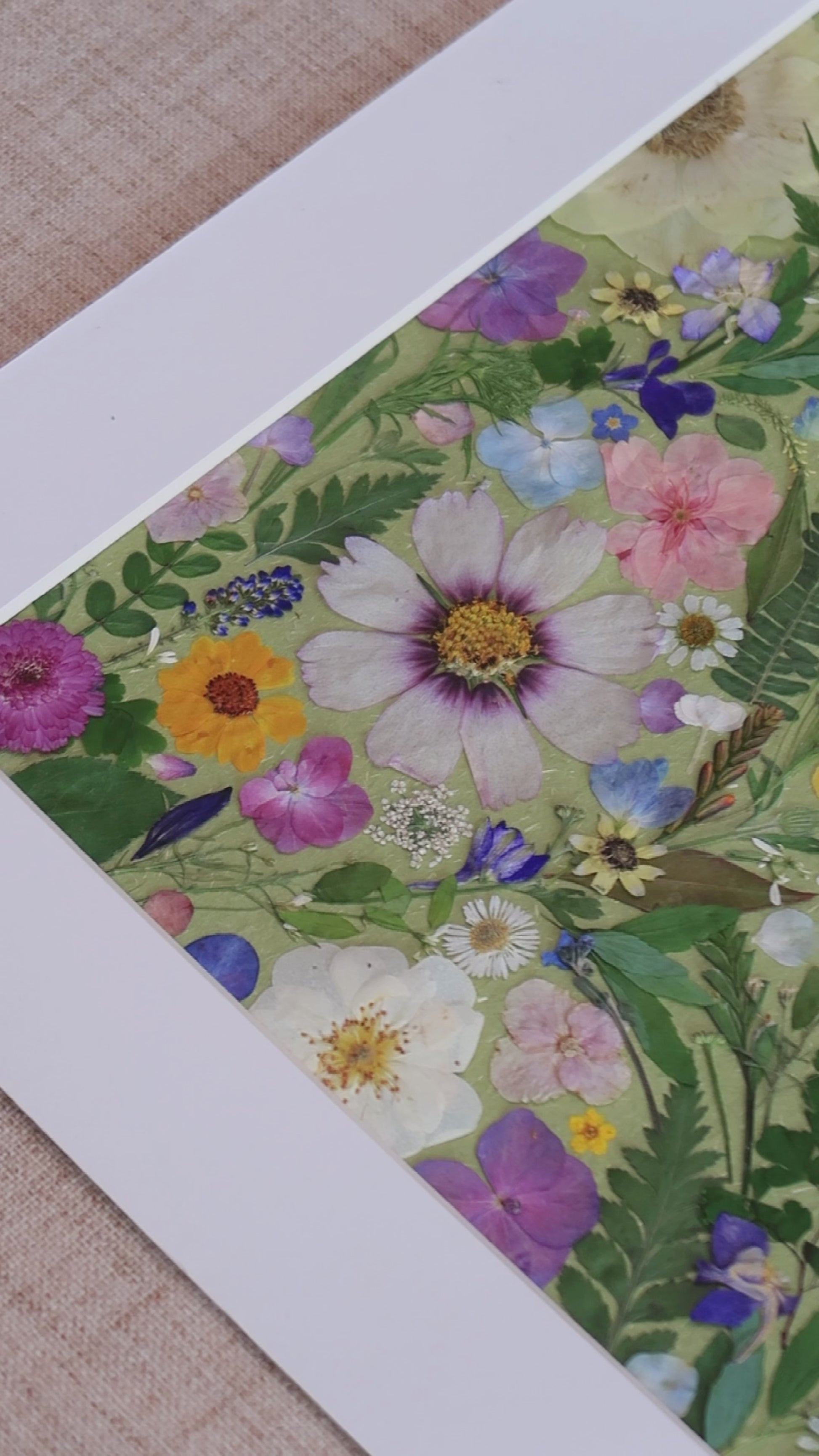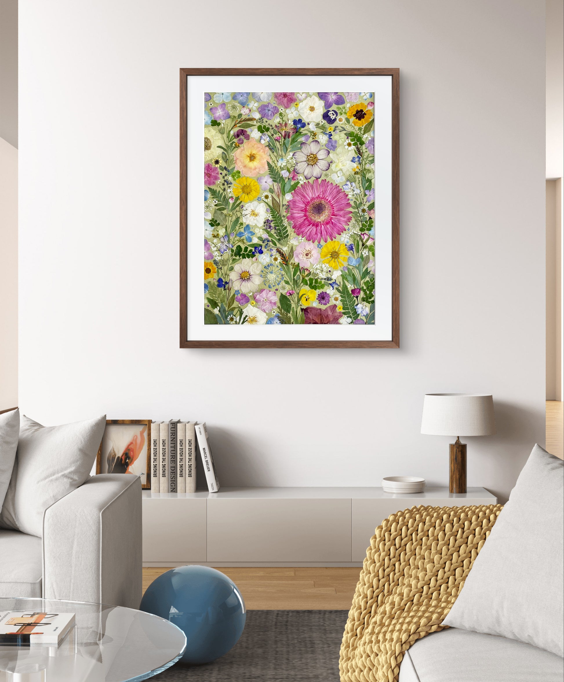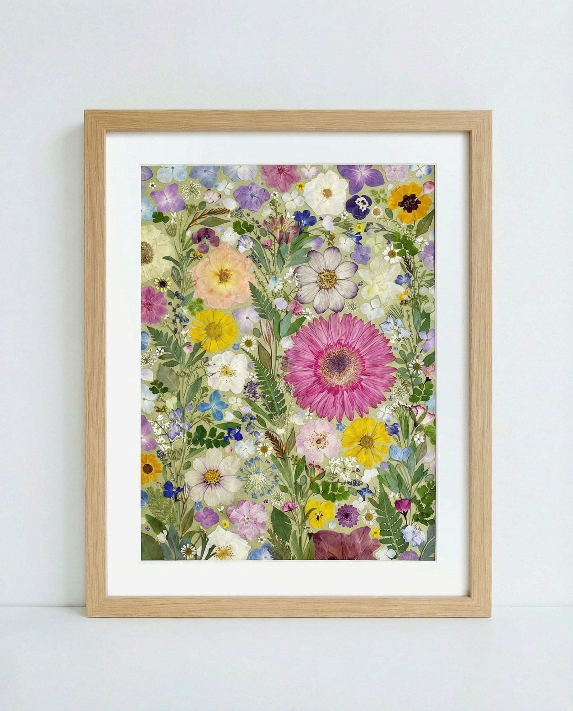This is a large-sized pressed floral frame artwork. Our florist carefully arranges and glues dried flower petals onto background paper, creating a unique design. Each petal is sourced from the finest seasonal blooms, meticulously chosen and pressed by our skilled florists.