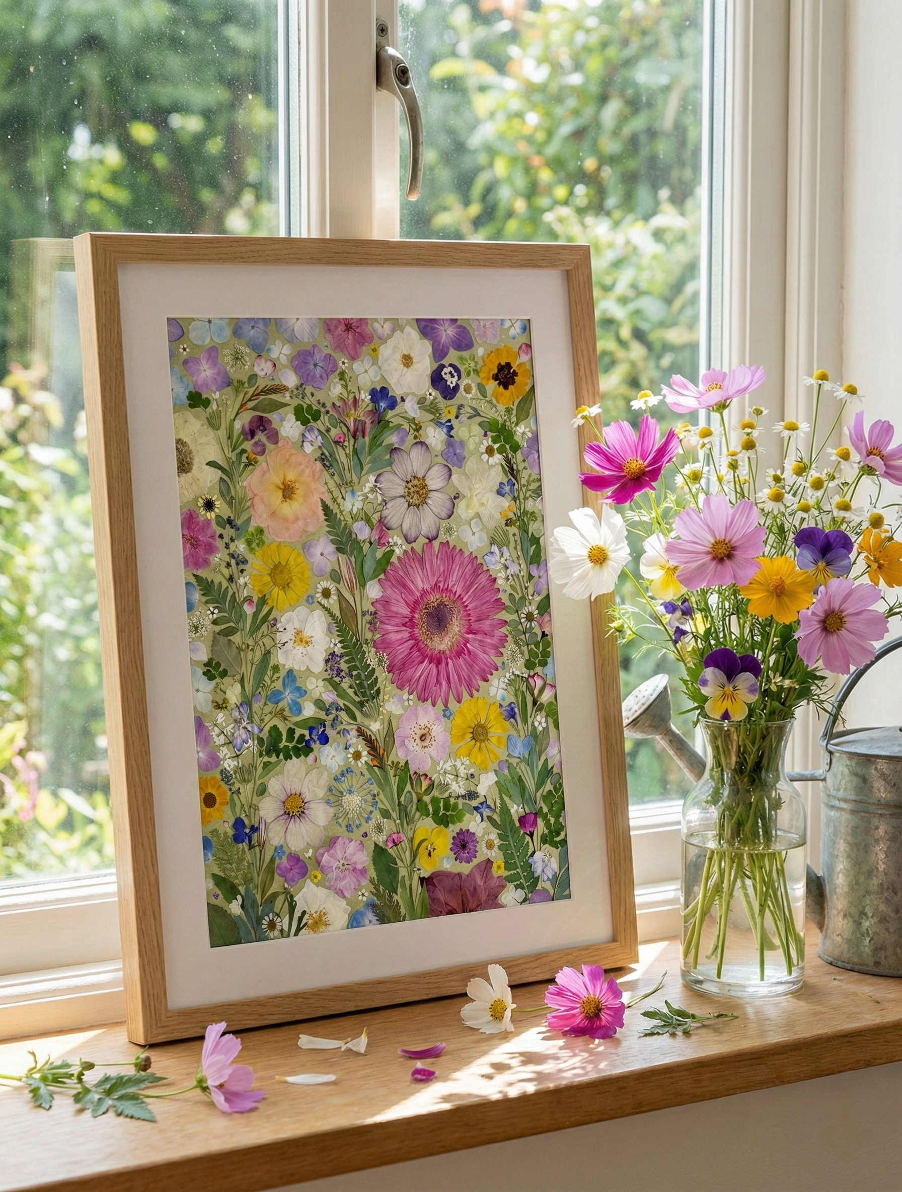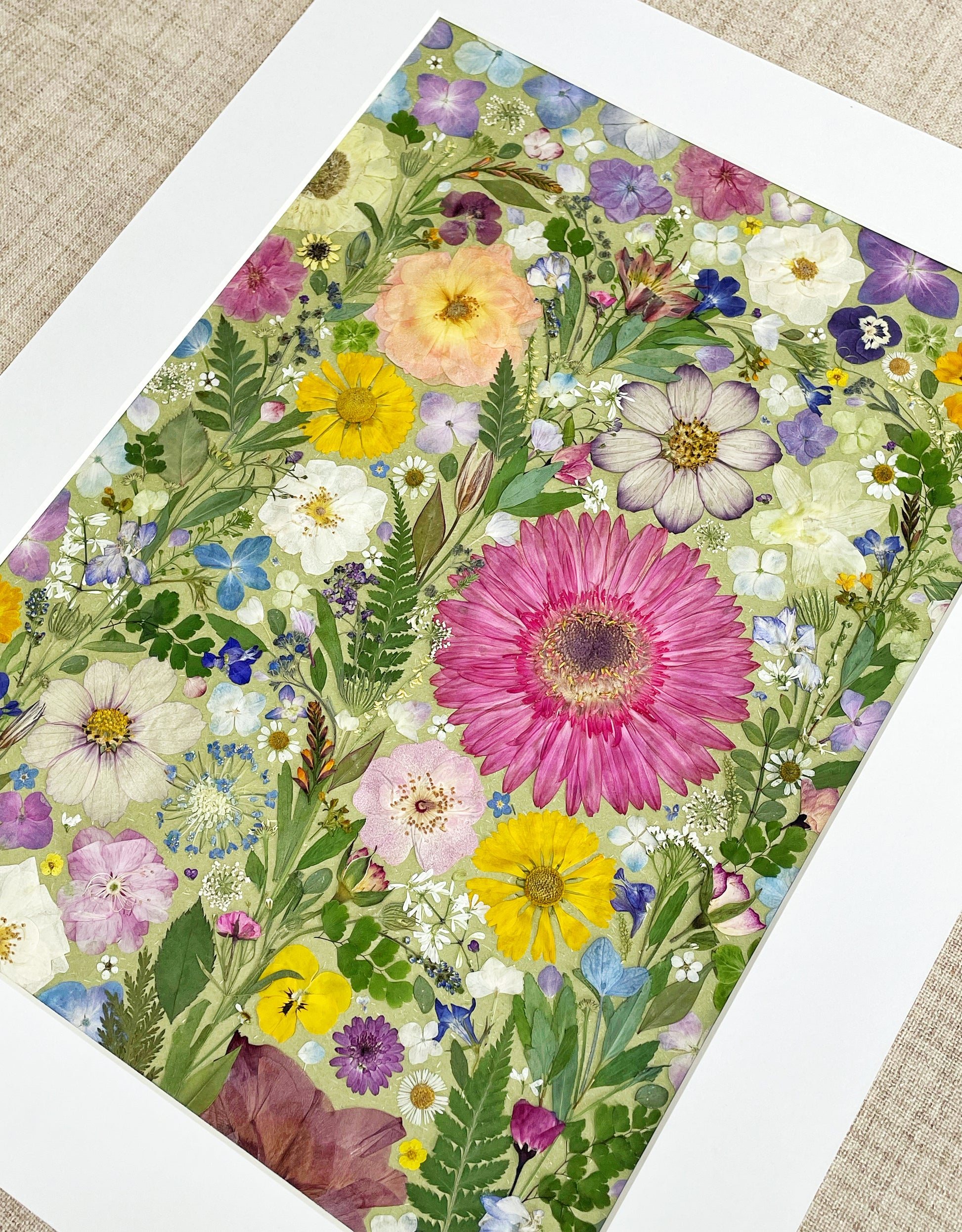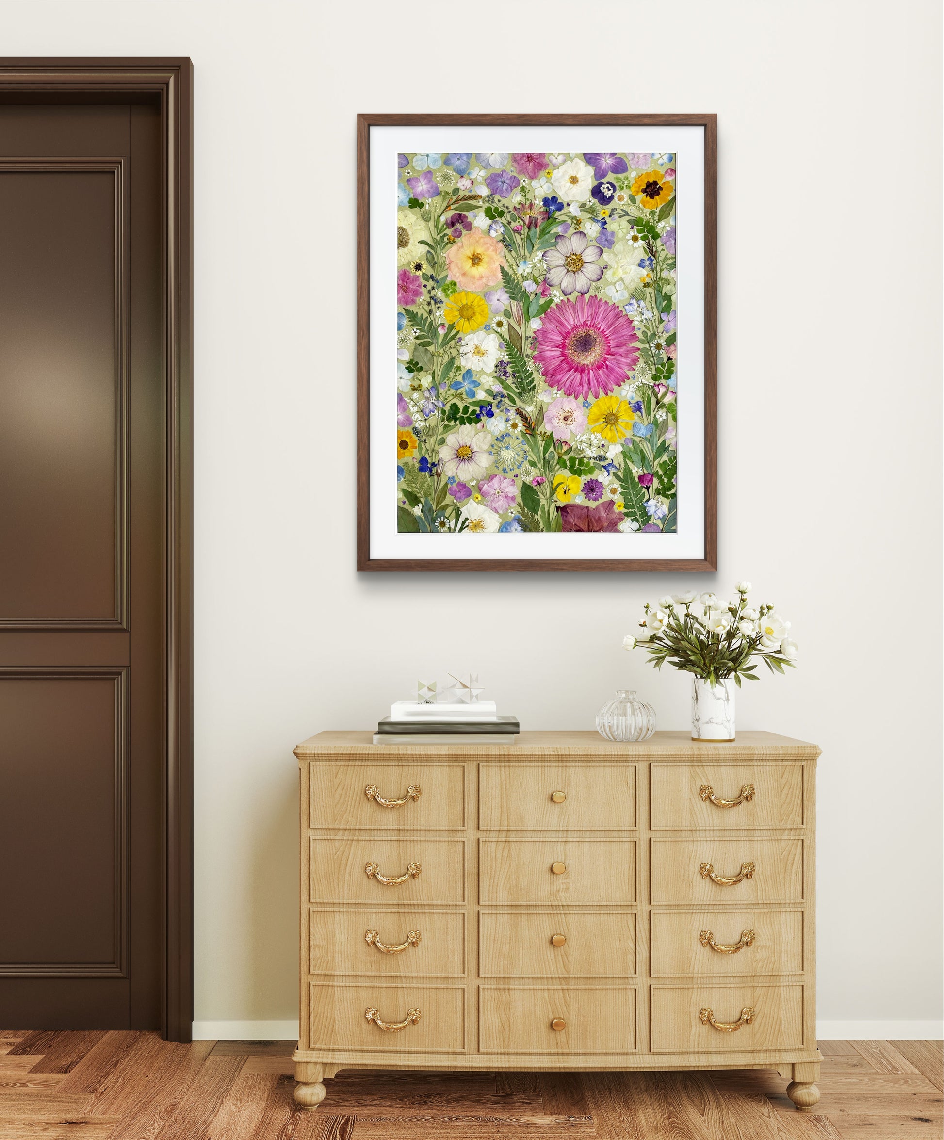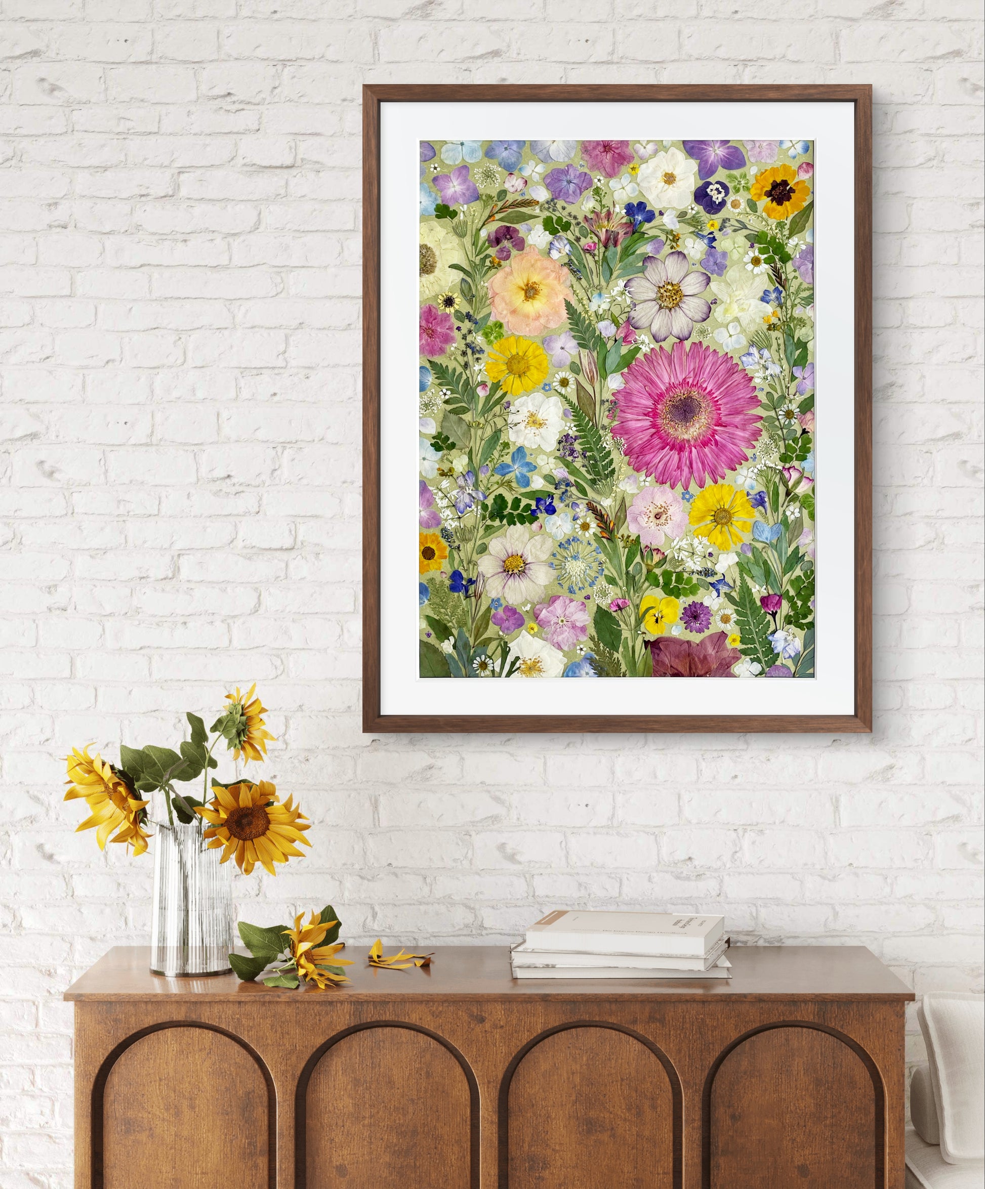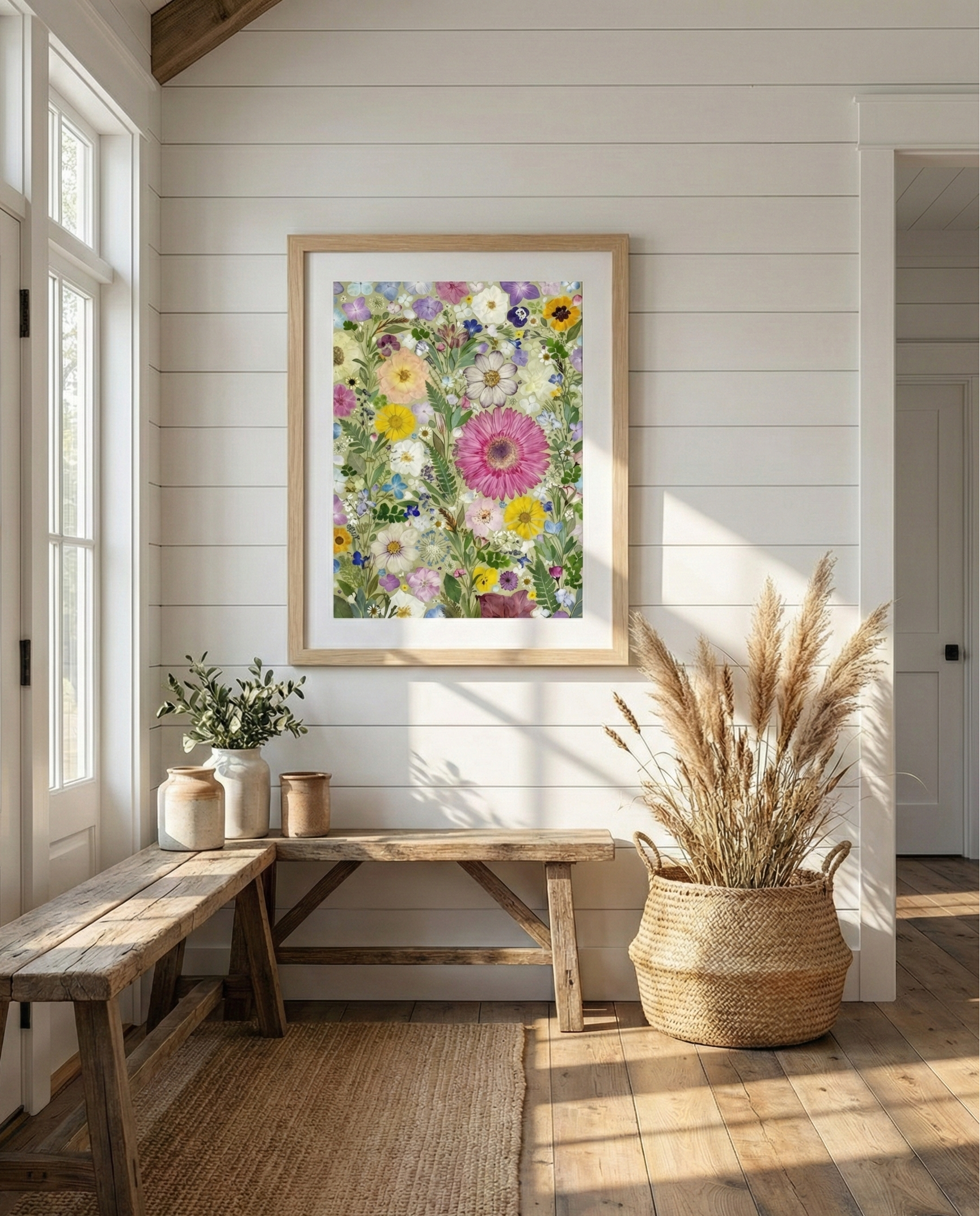 This is a large-sized pressed floral frame artwork. Our florist carefully arranges and glues dried flower petals onto background paper, creating a unique design. Each petal is sourced from the finest seasonal blooms, meticulously chosen and pressed by our skilled florists.
