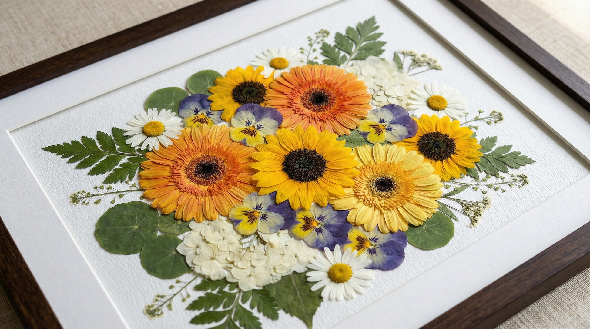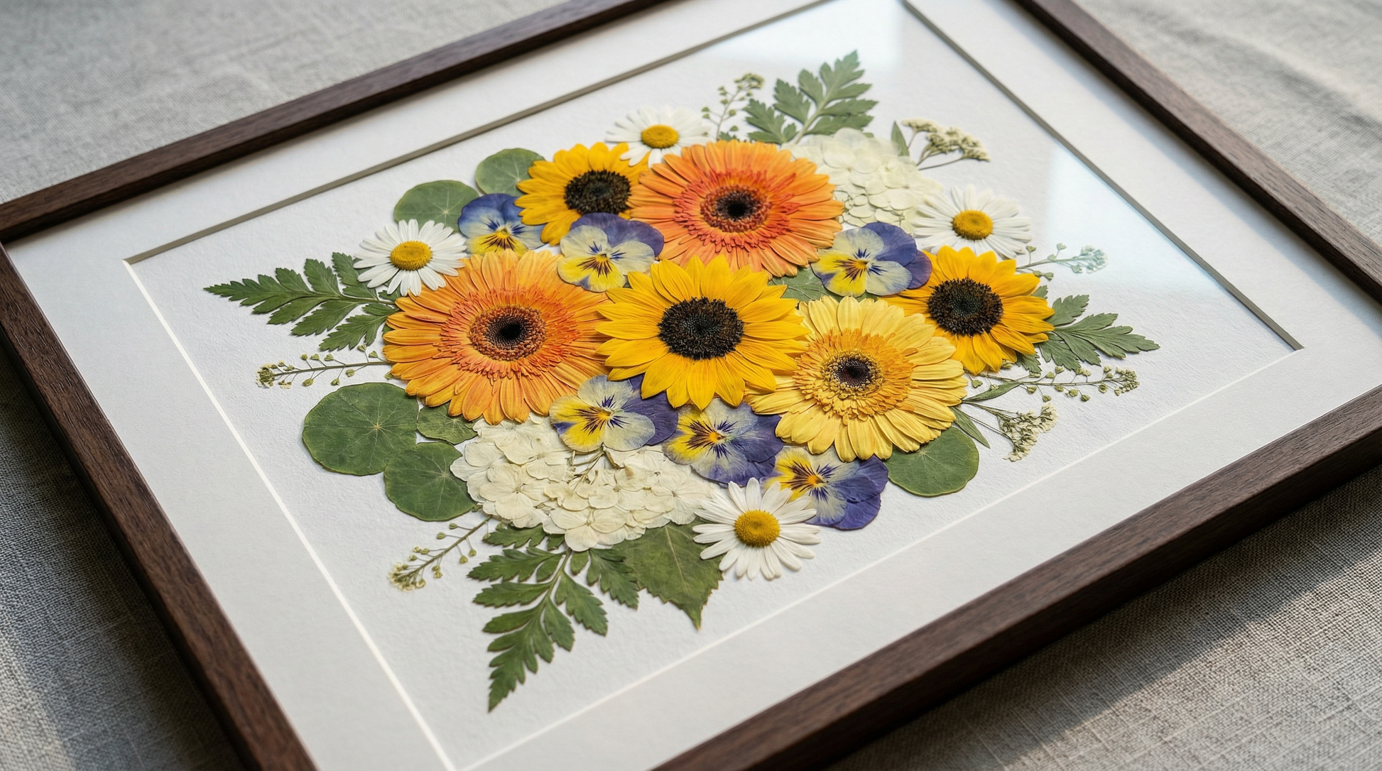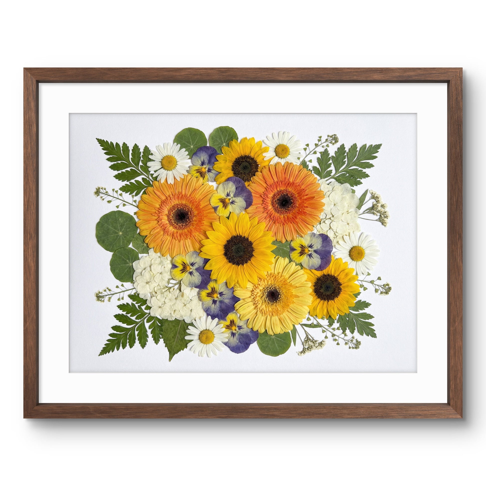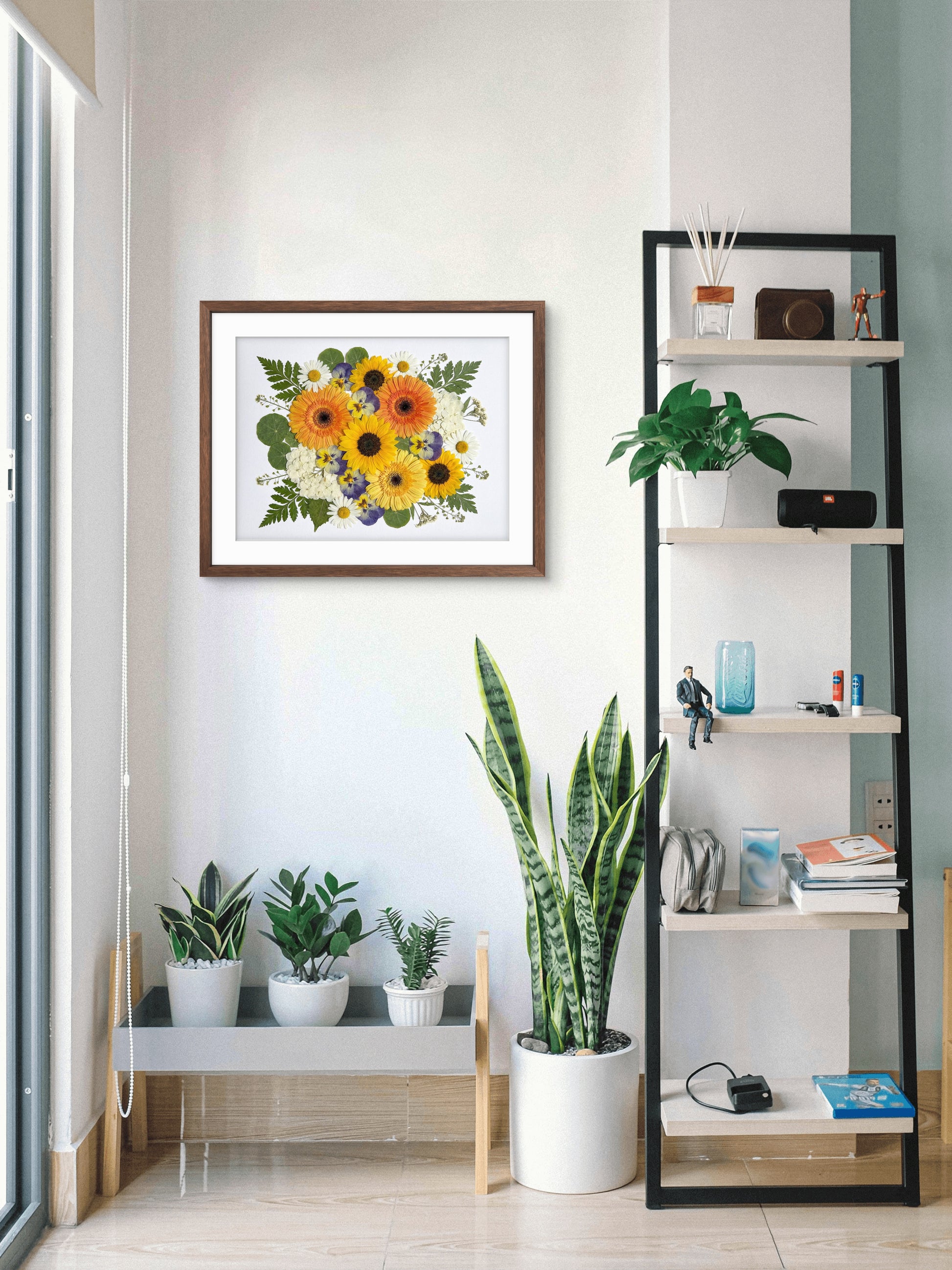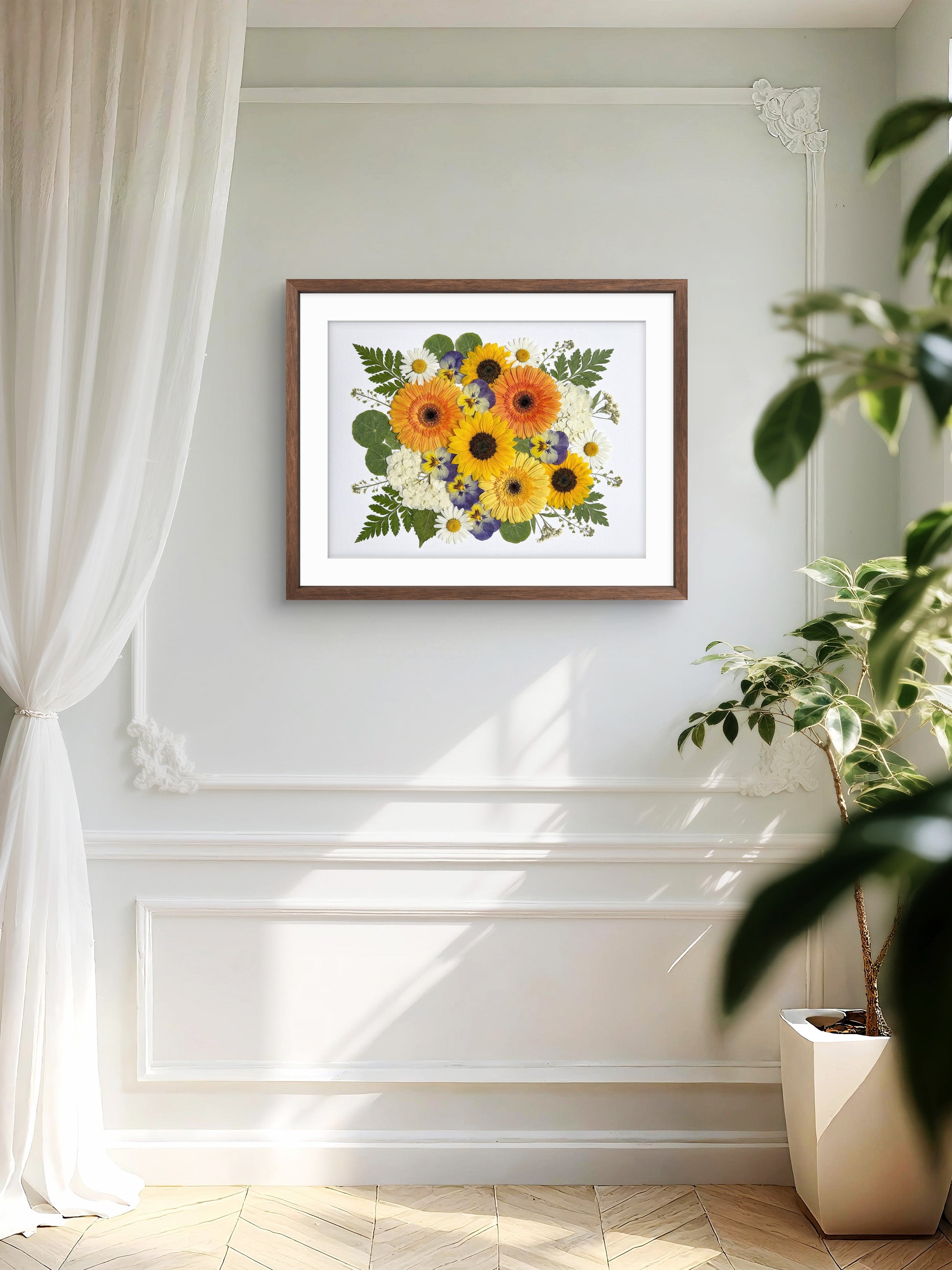 Our florist carefully arranges and glues dried flower petals onto background paper, creating a unique design. Each petal is sourced from the finest seasonal blooms, meticulously chosen and pressed by our skilled florists.