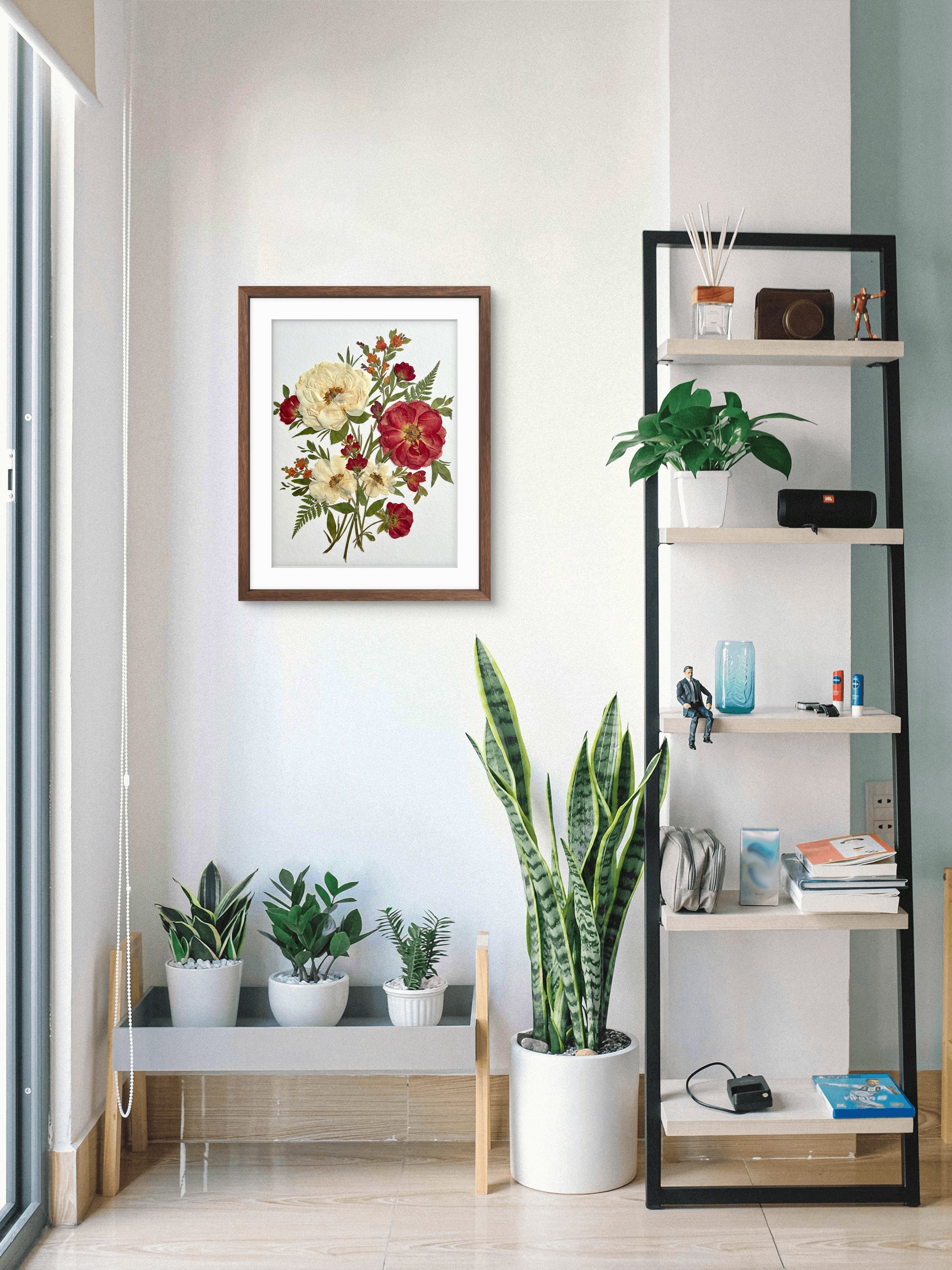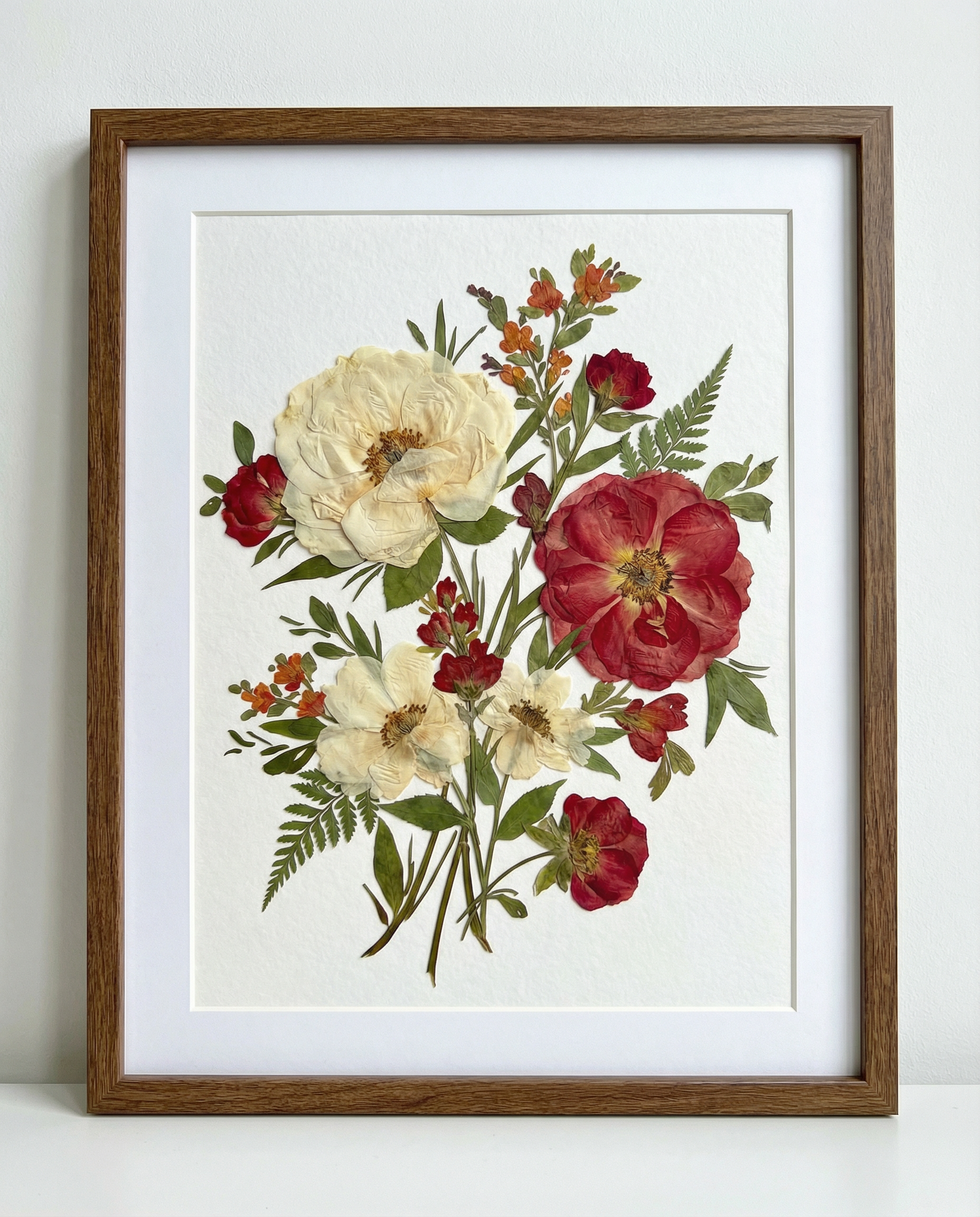 Our florist carefully arranges and glues dried flower petals onto background paper, creating a unique design. Each petal is sourced from the finest seasonal blooms, meticulously chosen and pressed by our skilled florists.