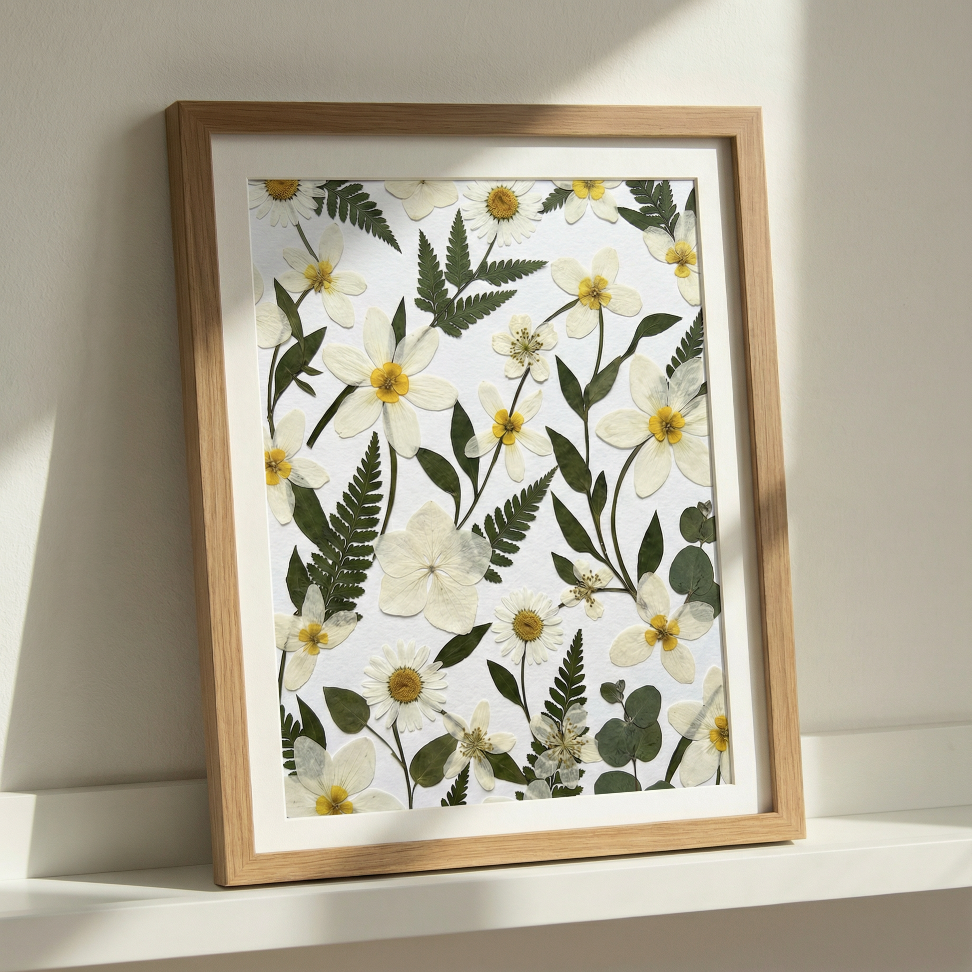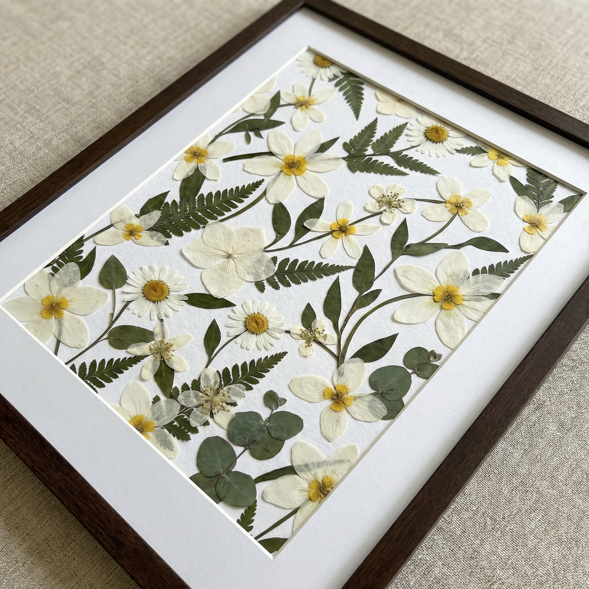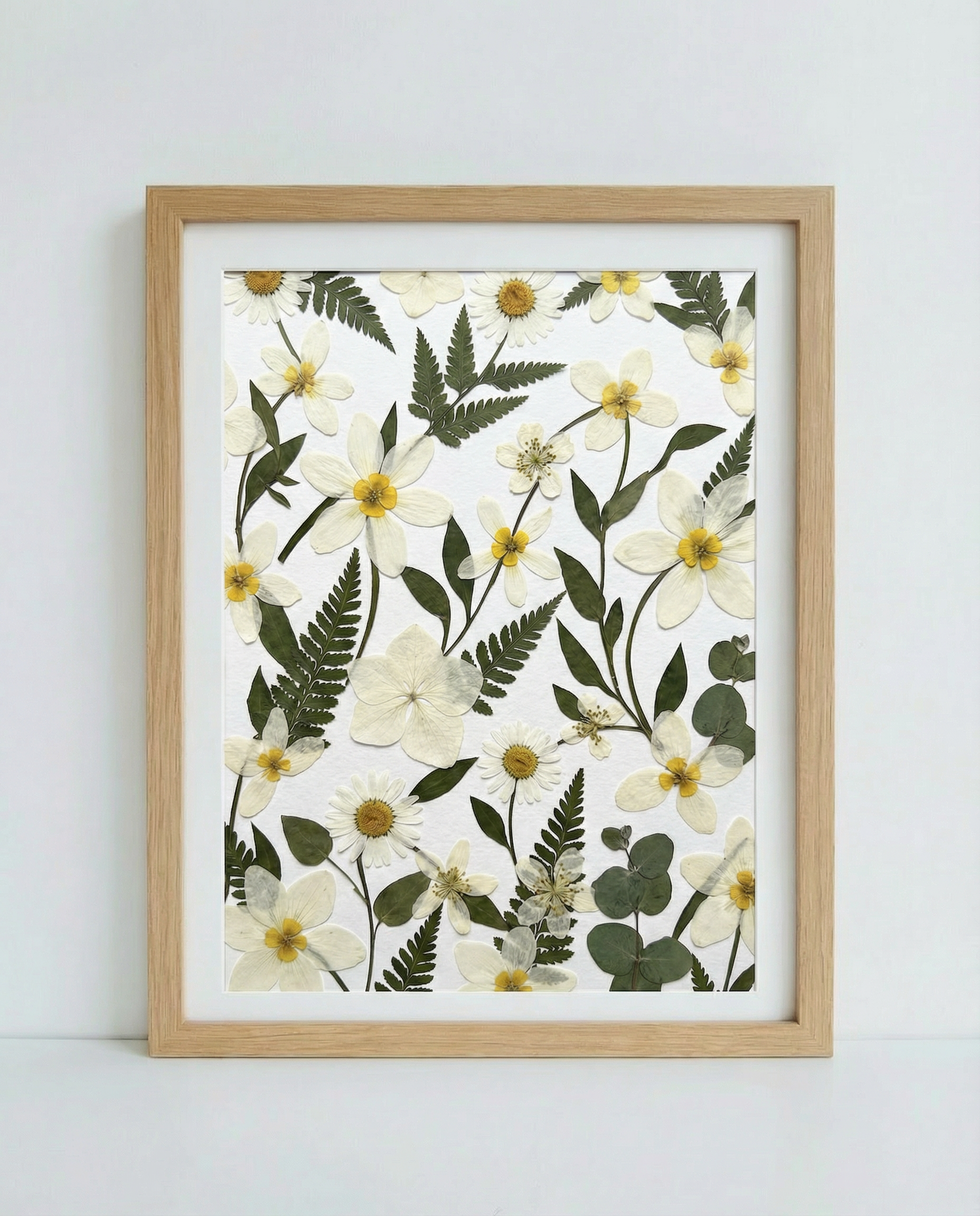 Our florist carefully arranges and glues dried flower petals onto background paper, creating a unique design. Each petal is sourced from the finest seasonal blooms, meticulously chosen and pressed by our skilled florists.